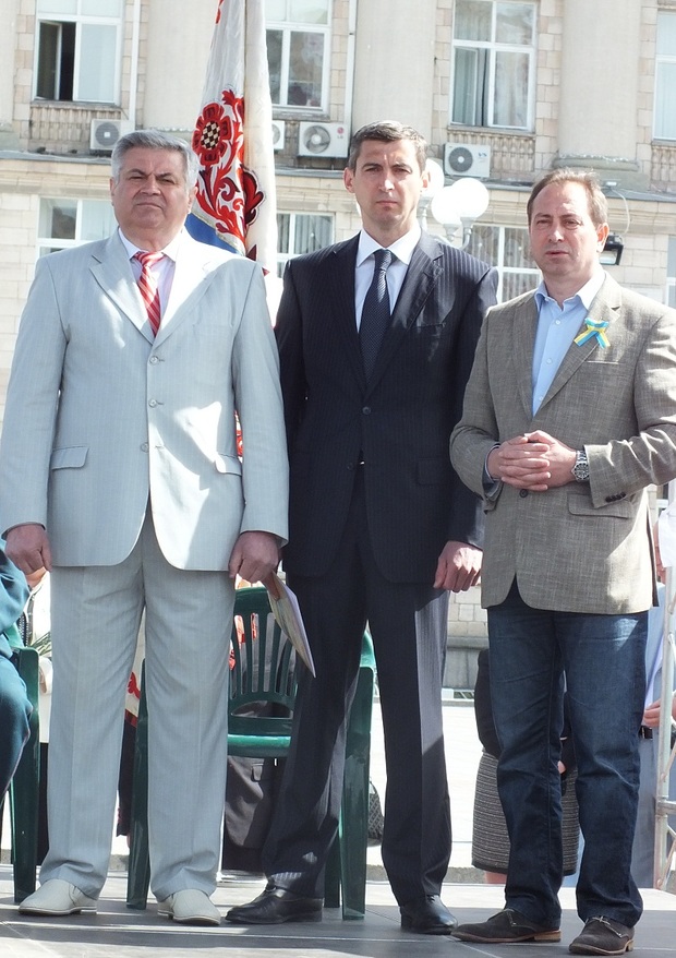 На встановленій площі виступають голова Черкаської ОДА Юрій Ткаченко, голова облради Валентина Коваленко, в. о. міського голови Віктор Білоусов, нардеп Микола Томенко та інші представники влади.