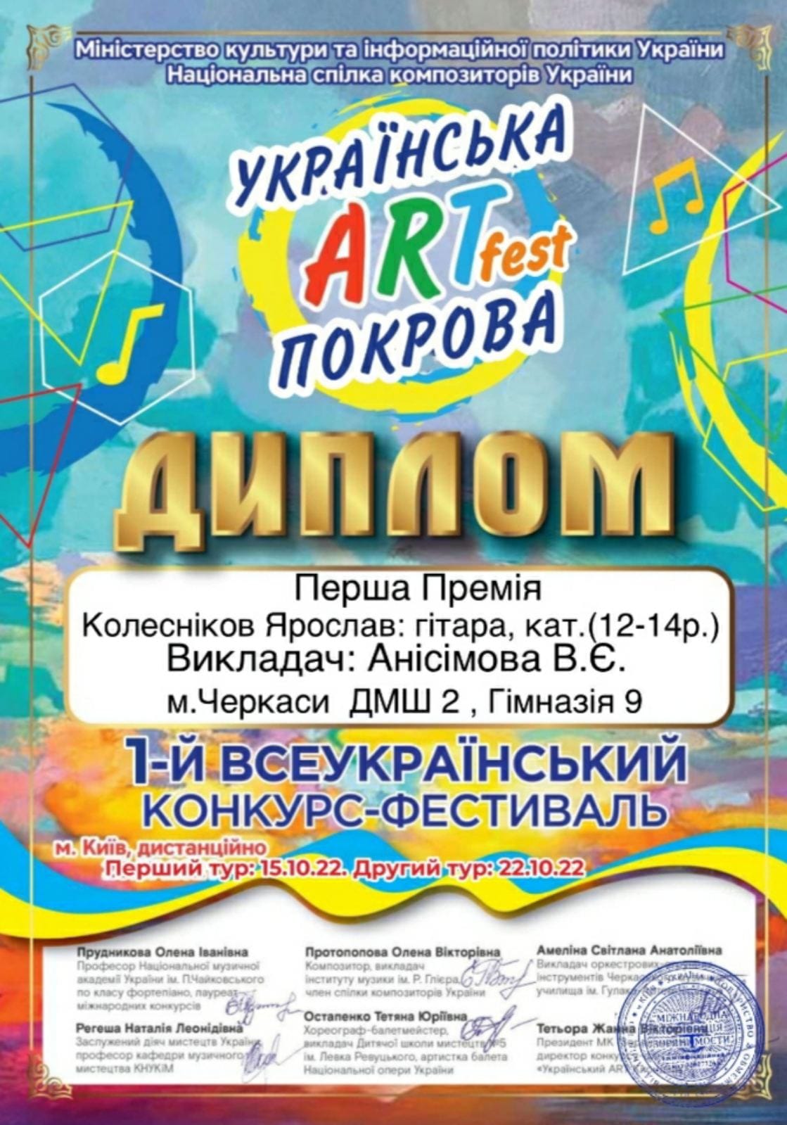 Високі результати показав також учень класу гітари Ярослав Колесніков. Музиканта нагородили дипломом І премії на Першому Всеукраїнському конкурсі-фестивалі «Art-fest Українська Покрова».