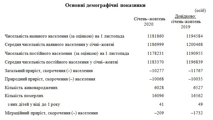 Так, станом на 1 листопада чисельність наявного населення становила 1181860 осіб, з них 674,8 тисяч жителів міста та 507,1 тисяч – села. Про це інформують в Головному управлінні статистики.