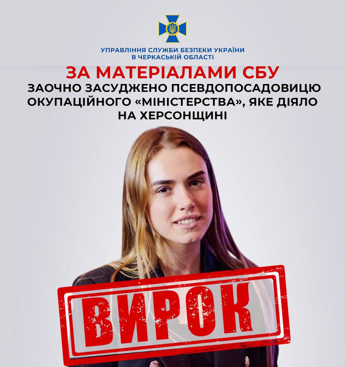За матеріалами СБУ заочно засуджено псевдопосадовицю окупаційного «міністерства». 15 років ув’язнення з конфіскацією майна заочно отримала ще колаборантка, яка працювала на рашистів на тимчасово окупованій території Херсонської області. Повідомляє Управління СБУ в Черкаській області.