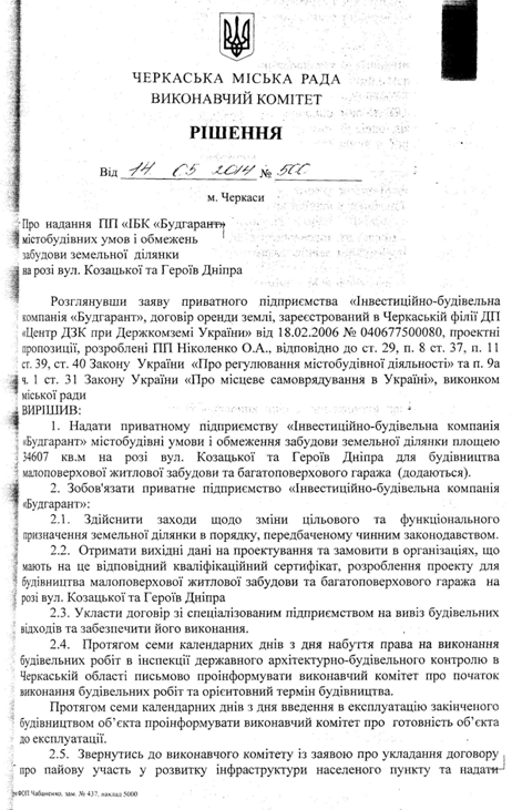 Відповідно до містобудівних умов і обмежень забудови земельної ділянки на розі вул. Козацької та Героїв Дніпра, які й видані "Будгаранту" відповідно до рішення, підписаного тодішнім секретарем міської ради Віктором Білоусовим, фірма "Будгарант" має здійснити заходи щодо зміни цільового та функціонального призначення земельної ділянки, яка нині належить до земель водного фонду. Згідно з цим же документом, тут розміщуватиметься малоповерхова будівля (до 5 поверхів) та багатоповерховий гараж.